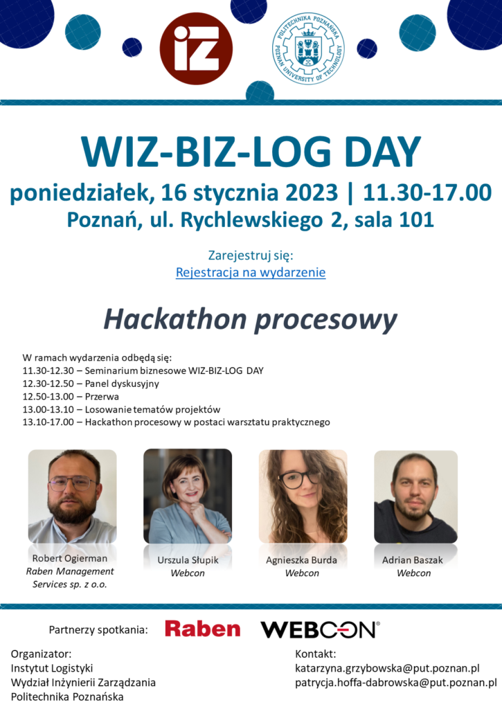 W ramach wydarzenia odbędą się: (1) Seminarium biznesowe WIZ-BIZ-LOG DAY; (2) Panel dyskusyjny; (3) Hackathon procesowy w postaci warsztatu praktycznego.
