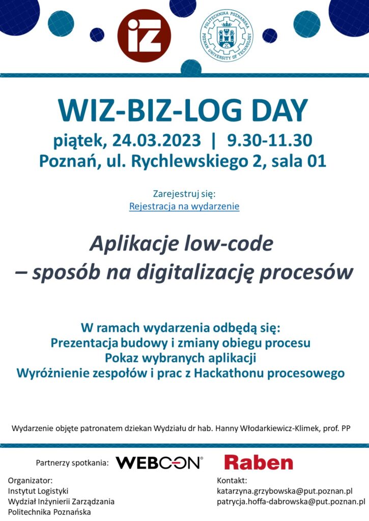Zapraszamy studentów i wszystkich zainteresowanych na wydarzenie z serii WIZ-BIZ LOG DAY, które odbędzie się 24.03.2023 w godzinach 09.30-11.30 w sali 01 budynku Wydziału Architektury i Wydziału Inżynierii Zarządzania.